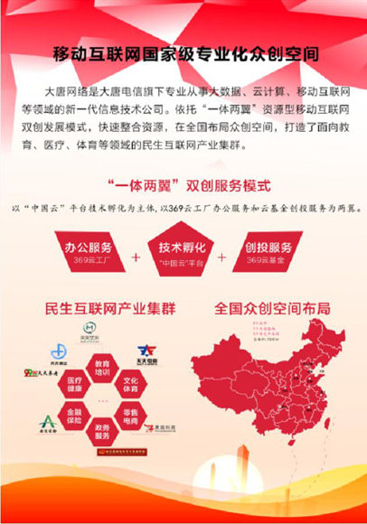 大唐電信作為最大股東的大唐網(wǎng)絡(luò),聚焦民生改善與行業(yè)升級的信息化服務(wù),構(gòu)建了以安全可信的“中國云”平臺為主體,369云工廠眾創(chuàng)空間體系和369云基金投融資體系為兩翼的“一體兩翼”資源型移動互聯(lián)網(wǎng)創(chuàng)新發(fā)展模式,并在北京、西安、大連、天津、南昌、太原、陽泉、重慶等地落地雙創(chuàng)基地,根據(jù)當(dāng)?shù)卣邔?dǎo)向和產(chǎn)業(yè)發(fā)展,構(gòu)建垂直領(lǐng)域產(chǎn)業(yè)集群,助推地區(qū)雙創(chuàng)發(fā)展。目前,大唐網(wǎng)絡(luò)已被授予移動互聯(lián)網(wǎng)國家級專業(yè)化眾創(chuàng)服務(wù)平臺,是國家發(fā)改委認(rèn)定的國家重點支持項目。